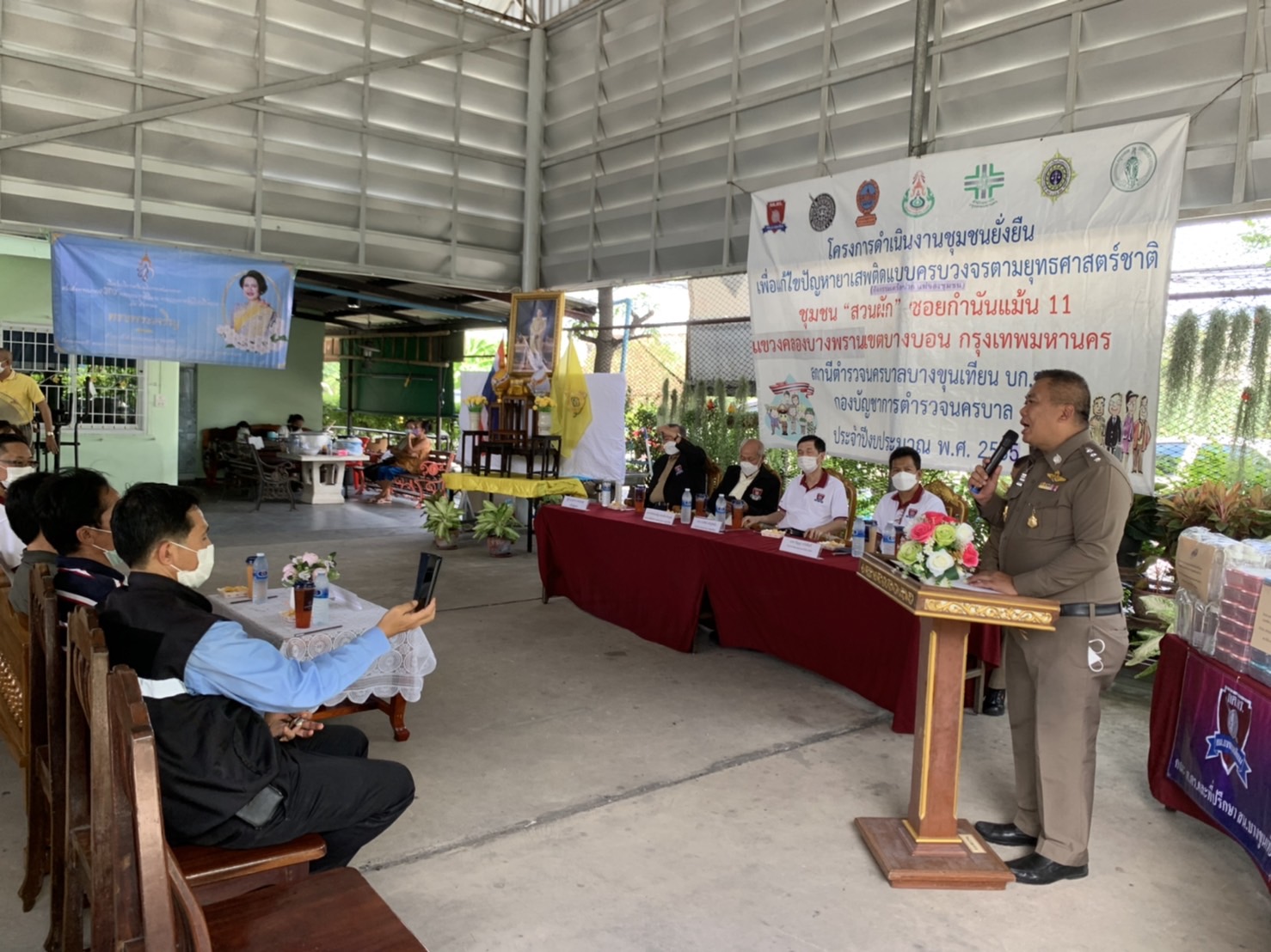 เรียนผู้บังคับบัญชา เมื่อวันที่ 10 ส.ค.65 เวลา 1 4.00 น. สน.บางขุนเทียน จัดกิจกรรม “เครือข่ายแม่ของชุมชนเพื่อดูแลลูกหลานในชุมชน” ตามโครงการดำเนินงานชุมชนยั่งยืนเพื่อแก้ไขปัญหายาเสพติดแบบครบวงจร ตามยุทธศาสตร์ชาติ เพื่อการติดตามการบำบัดผู้เสพอย่างต่อเนื่อง และป้องกันปัญหายาเสพติดในชุมชน โดยมี พ.ต.อ.ธีรชัย เด็ดขาด รอง ผบก.น 9 ประธานในพิธี พ.ต.อ..วิศิษฐ์ สังขนันท์ ผกก.สน.บางขุนเทียน ,พ.ต.ต.ศิววิชญ์ สมบูรณ์ผล รรท. รอง ผกก.ป. สน.ฯ ,พ.ต.ต.จักร์พันธ์ ทองใสพร สวป.สน.ฯ หน.ชุดปฏิบัติการ ,พ.ต.ต.หญิง ปฐพร สมบัติดี สว.อก .สน.บางขุนเทียน ,คณะ อนุ .กต.ตร. กทม. ,คณะ กต.ตร.สน.ฯ และ ที่ปรึกษา ฯ ,ผู้แทนสำนักงานเขตบางบอน ,ผู้แทนศูนย์บริการสาธารณสุข 65 ,ช่างตัดผม จากศูนย์วิชาชีพวัดจรรยาวาส ,ช่างซ่อมเครื่องไฟฟ้าจากเทคโนโลยีหมู่บ้านครู ,คณะกรรมการชุมชนสวนผัก ซอยกำนันแม้น 11 ,คณะกรรมการชุมชน ซอยกำนันแม้น 13, ชุดปฏิบัติการชุมชนยั่งยืน/จนท.ฝ่ายสือบสวน /จนท.ฝ่ายจร่จร /จนท.ฝ่าย อำนวยการ โดยดำเนินกิจกรรม ดังนี้ -ให้ความรู้แนวทางการดำเนินการชุมชนบำบัด (CBTx) -เสวนาการแก้ไขปัญหายาเสพติดในชุมชน ผ่านเครือข่ายแม่ของชุมชนเพื่อดูแลลูกหลานในชุมชน -มอบสิ่งของอุปโภค-บริโภค,ผลิตภัณฑ์พลาสติกของใช้ในครัวเรือนแก่ผู้ร่วมกิจกรรม ณ ที่ทำการชุมชนสวนผัก ซอยกำนันแม้น 11 แขวงคลองบางพราน เขตบางบอน กทม. จึงเรียนมาเพื่อโปรดทราบ